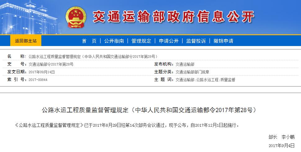 第四十九条 本规定自2017年12月1日起施行。交通部于1999年2月24日发布的《公路工程质量管理办法》(交公路发〔1999〕90号)、2000年6月7日发布的《水运工程质量监督规定》(交通部令2000年第3号)和2005年5月8日发布的《公路工程质量监督规定》(交通部令2005年第4号)同时废止。