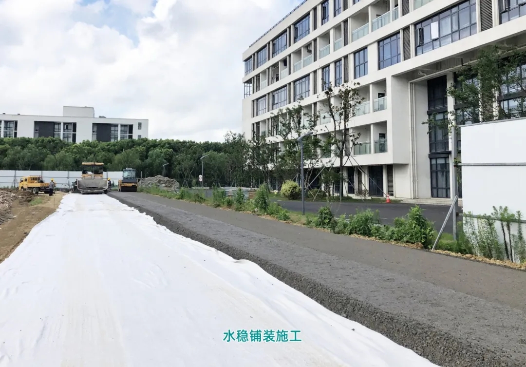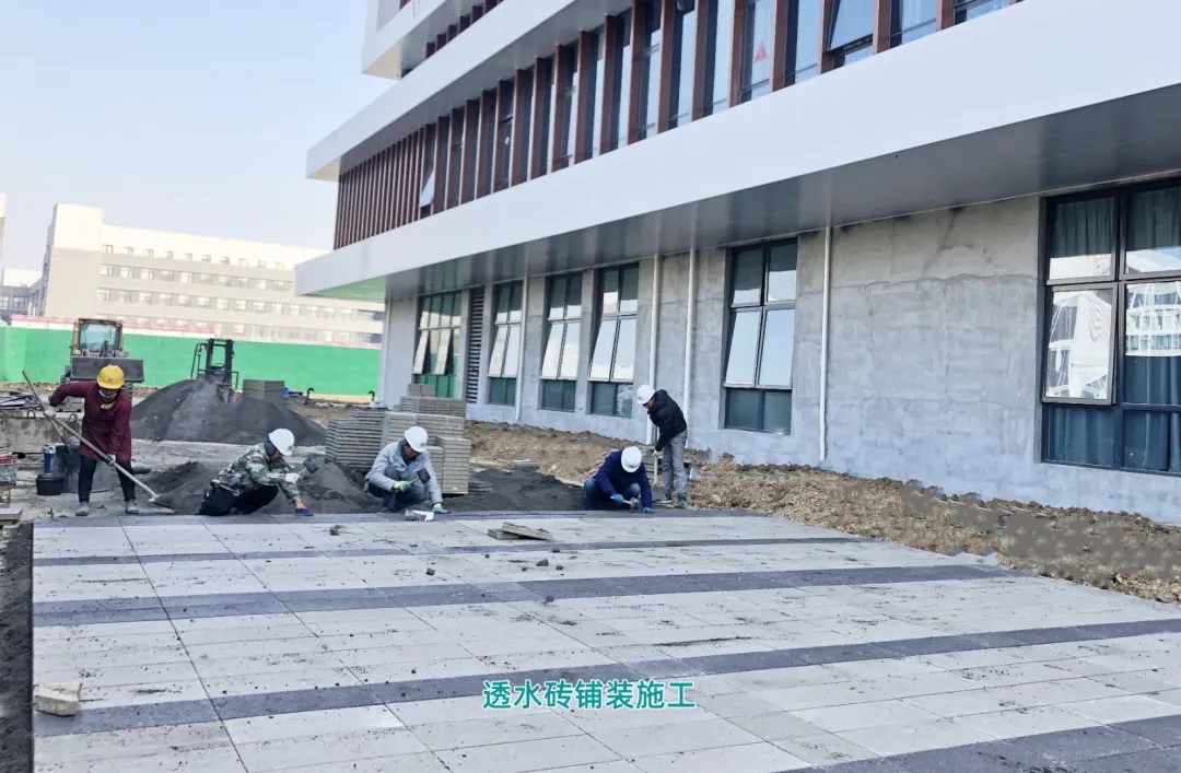 没有退路就是胜利之路。该工程交叉施工影响非常大,导致交工工期极为紧张。2021年5月项目部组织人员、机械设备准备进场,但现场土建脚手架仍未拆除,装修单位仍在施工,无工作面,经多次会议协调,直到6月15日部分段落才具备穿插施工条件。没有退路,只能向前,项目部精心统筹安排:进场材料如陶瓷透水砖、植草砖、需要定制加工的不锈钢井盖等,项目部与公司采购部门第一时间组织送样、检验、确认、预订,保证材料提前进场。