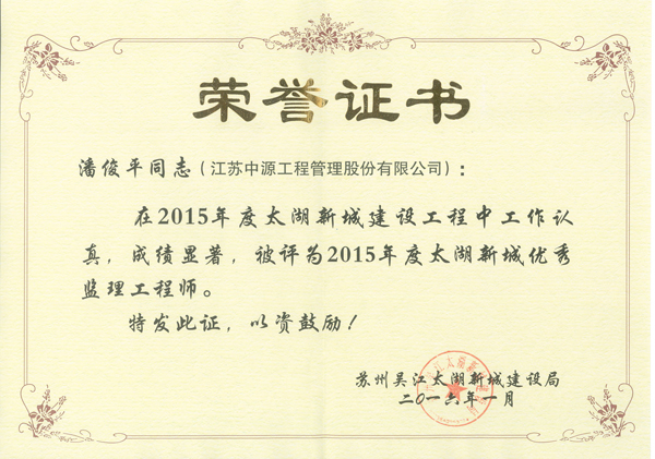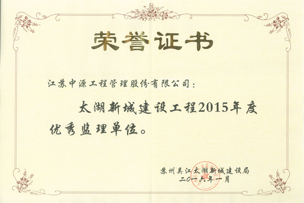 本次考评结果是综合了2015全年的考核排名,比较客观地反映了各施工及监理企业在太湖新城的实际施工及监理水平。其中由我公司监理的1302工程地面景观绿化工程、笠泽路流虹路跨内苏州河桥梁工程等项目均获得业主及各主管部门的肯定,并荣获了2015年度优秀监理单位及优秀监理工程师两项荣誉。