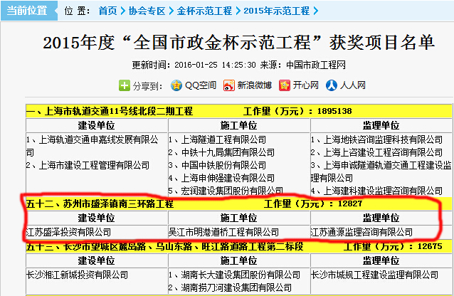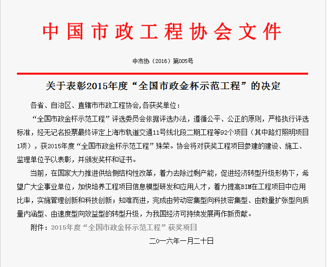 2016年01月20日,根据中国市政工程协会“中市协(2016)第005号”文件关于表彰2015年度“全国市政金杯示范工程”的决定,由我公司监理的苏州市盛泽镇南三环路工程荣获了2015年度“全国市政金杯示范工程”大奖!